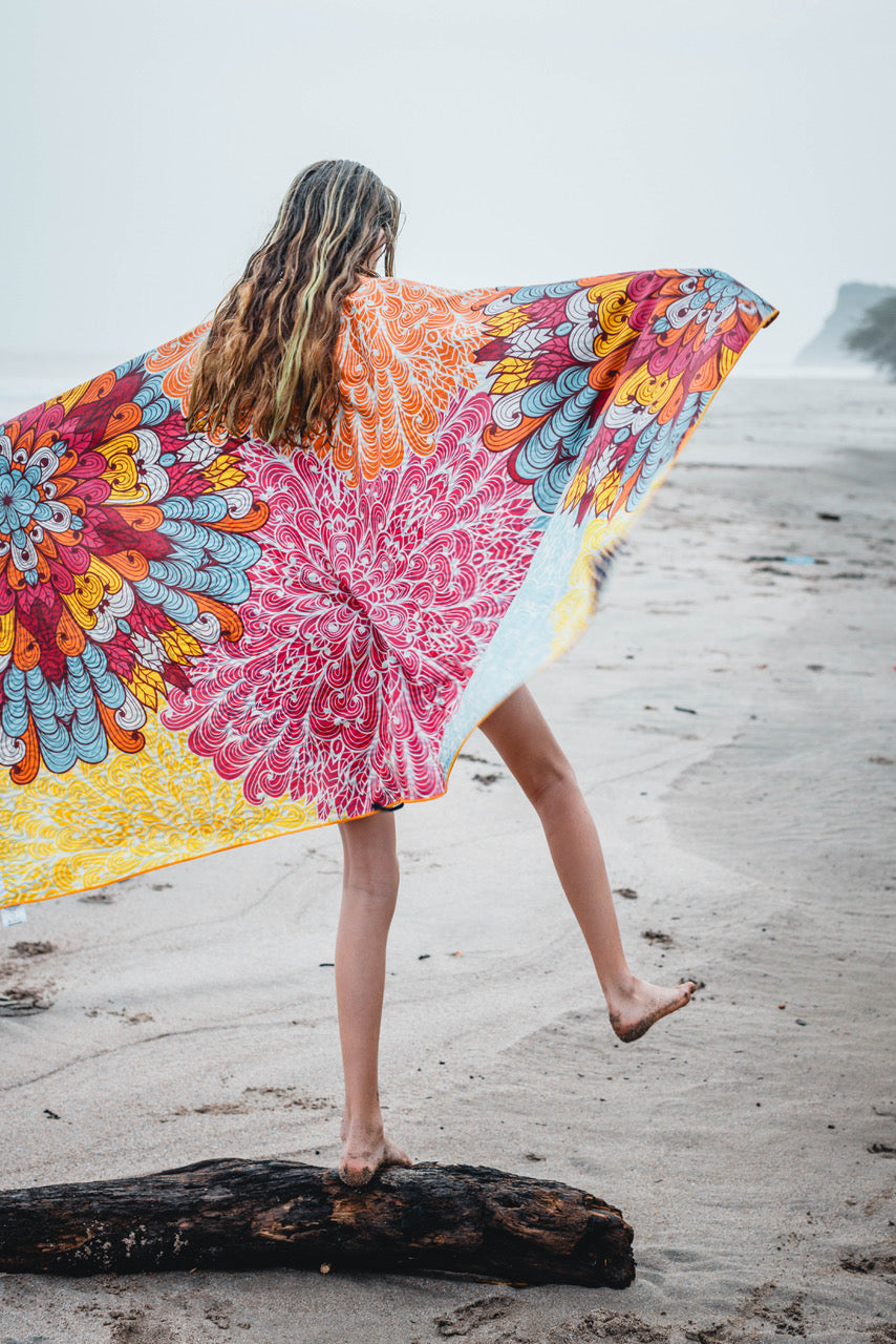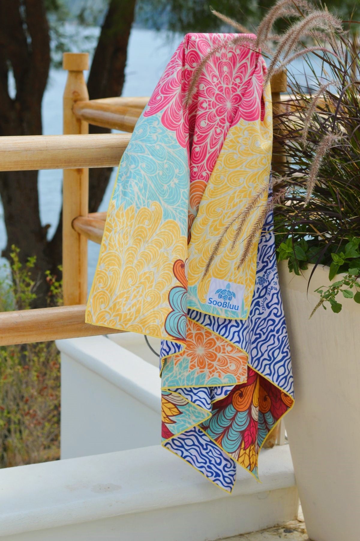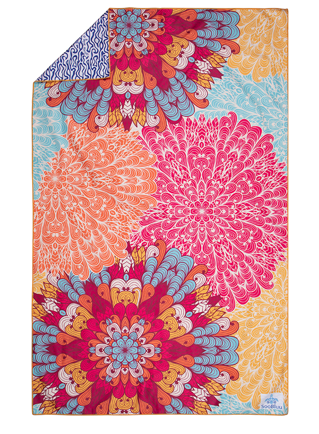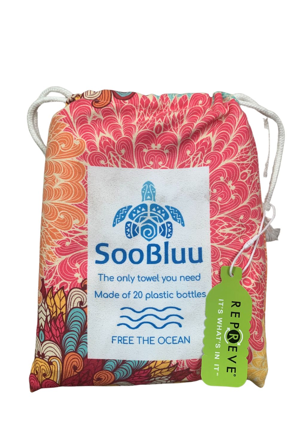 Sustainable, compact travel towel in a handy pouch featuring stunning illustrations of sea anemones in bright colors. Made from 20 recycled PET bottles (rPET), the towel is certified with the Repreve certificate.